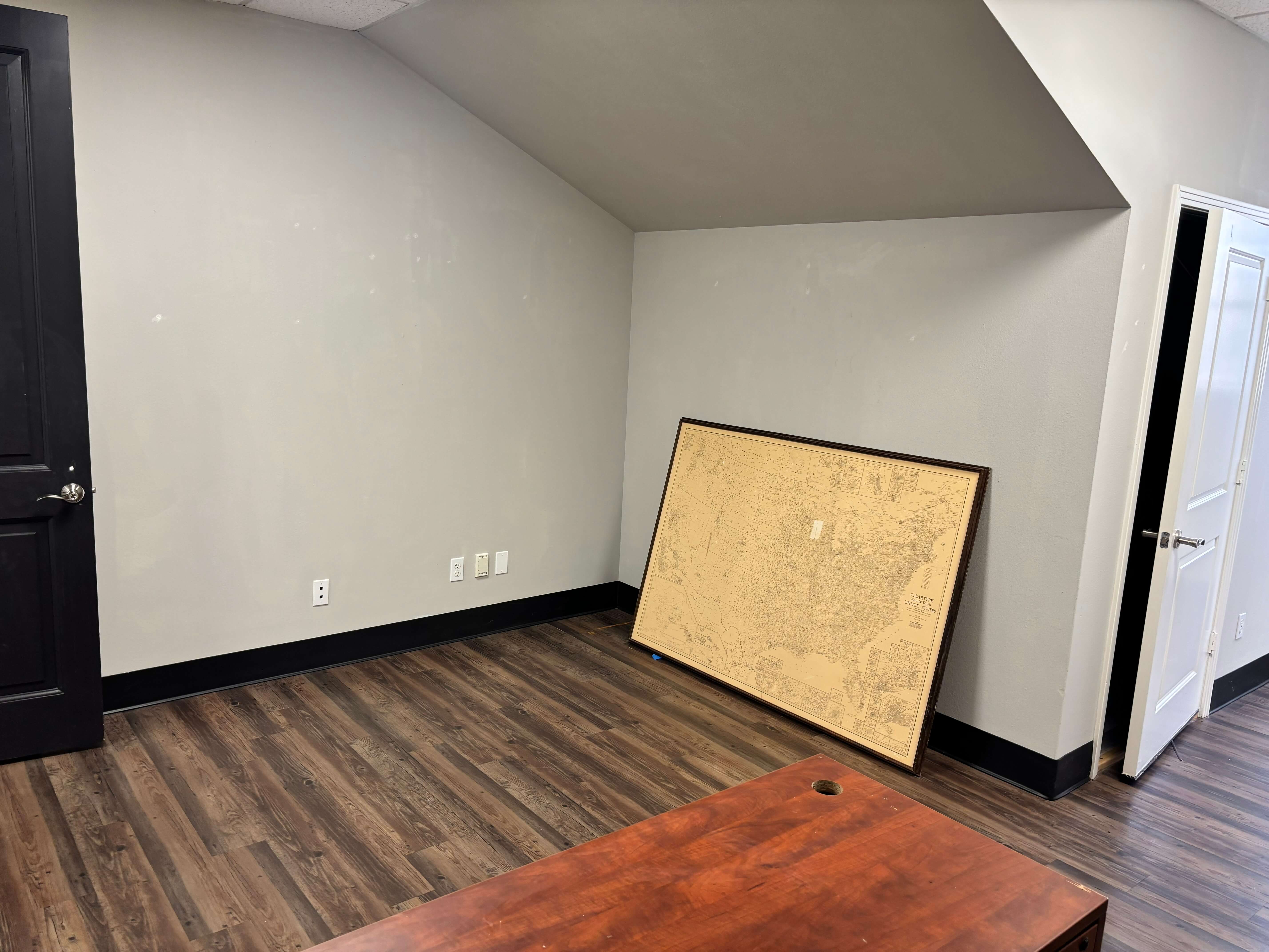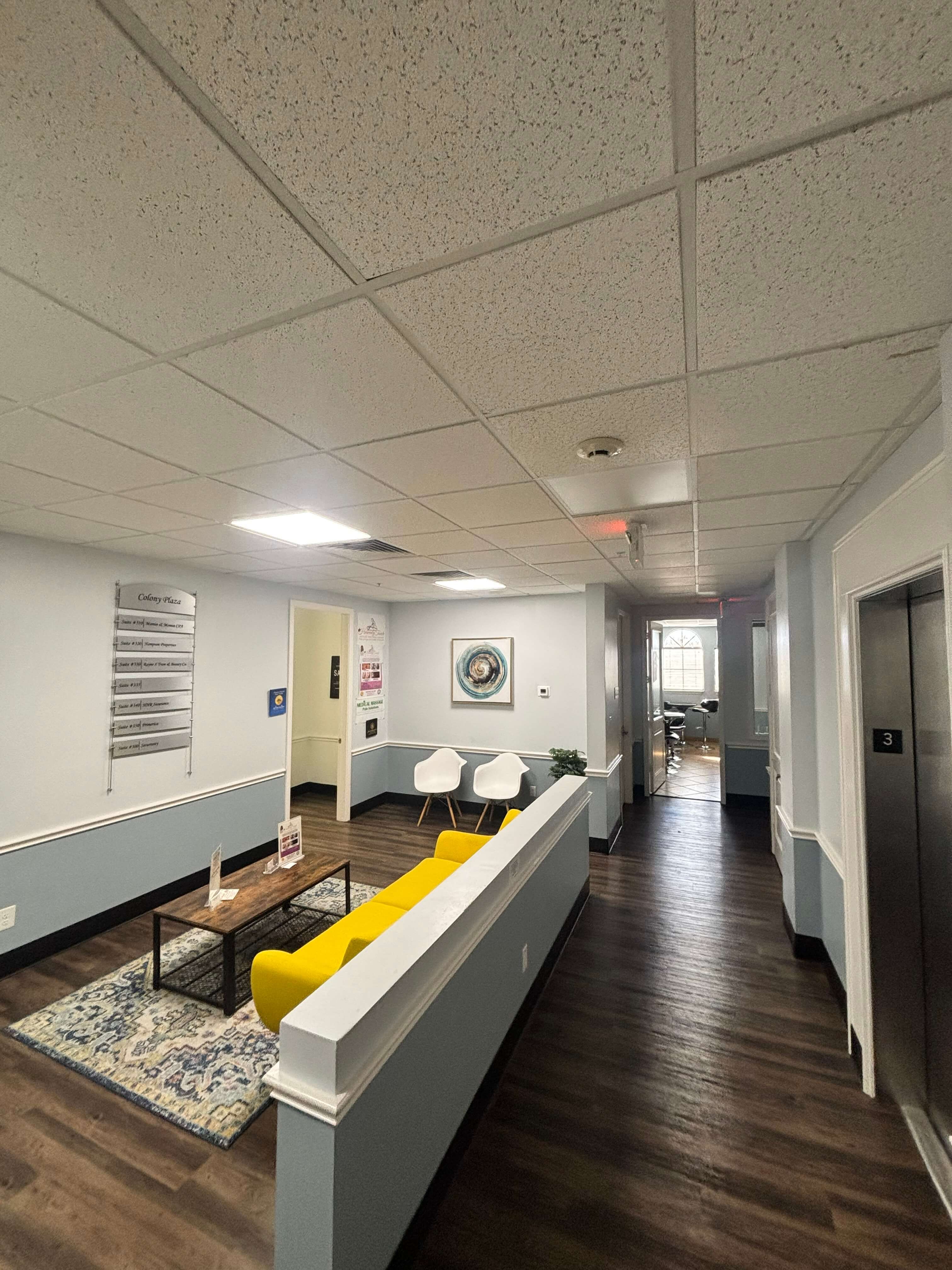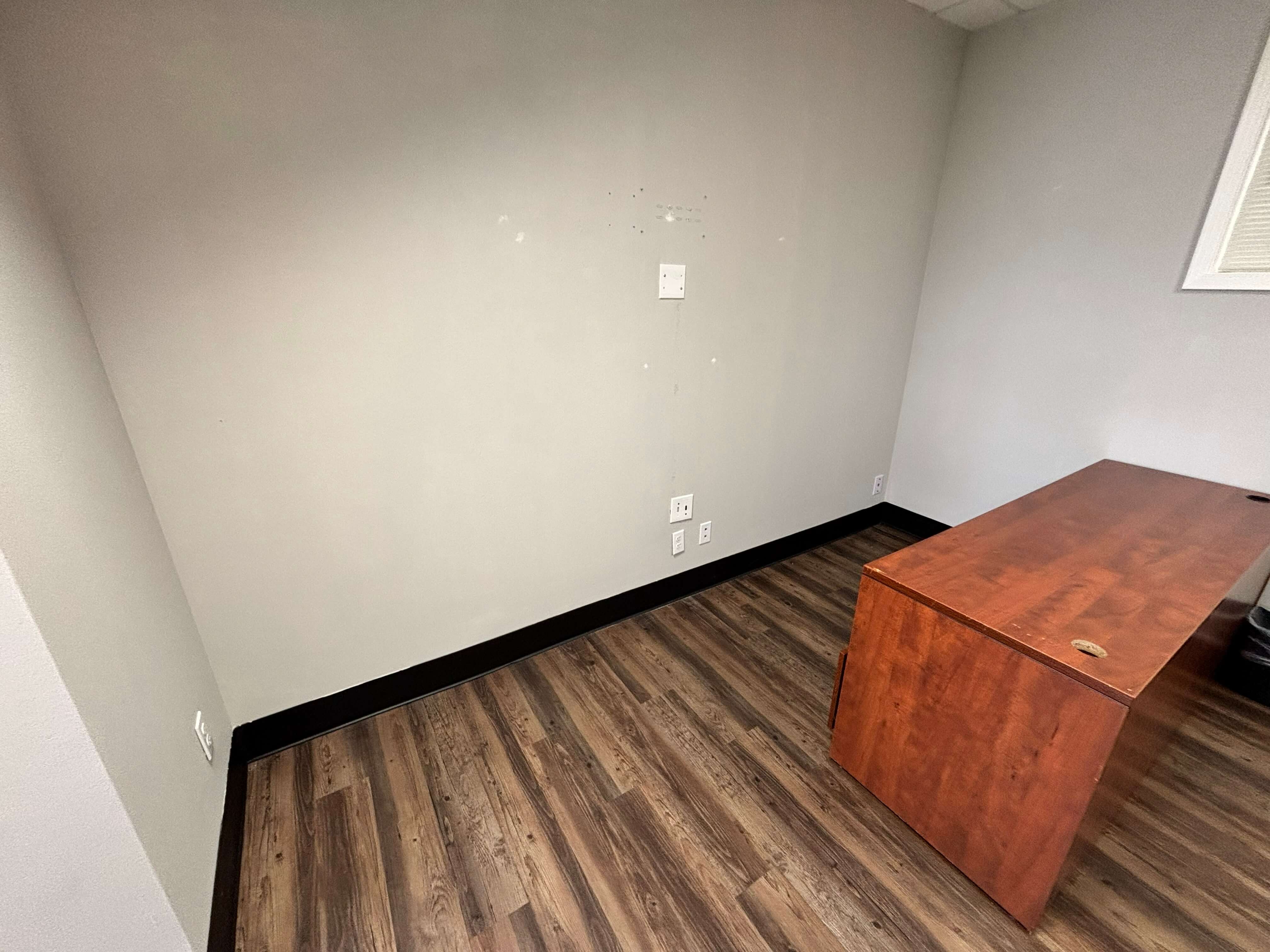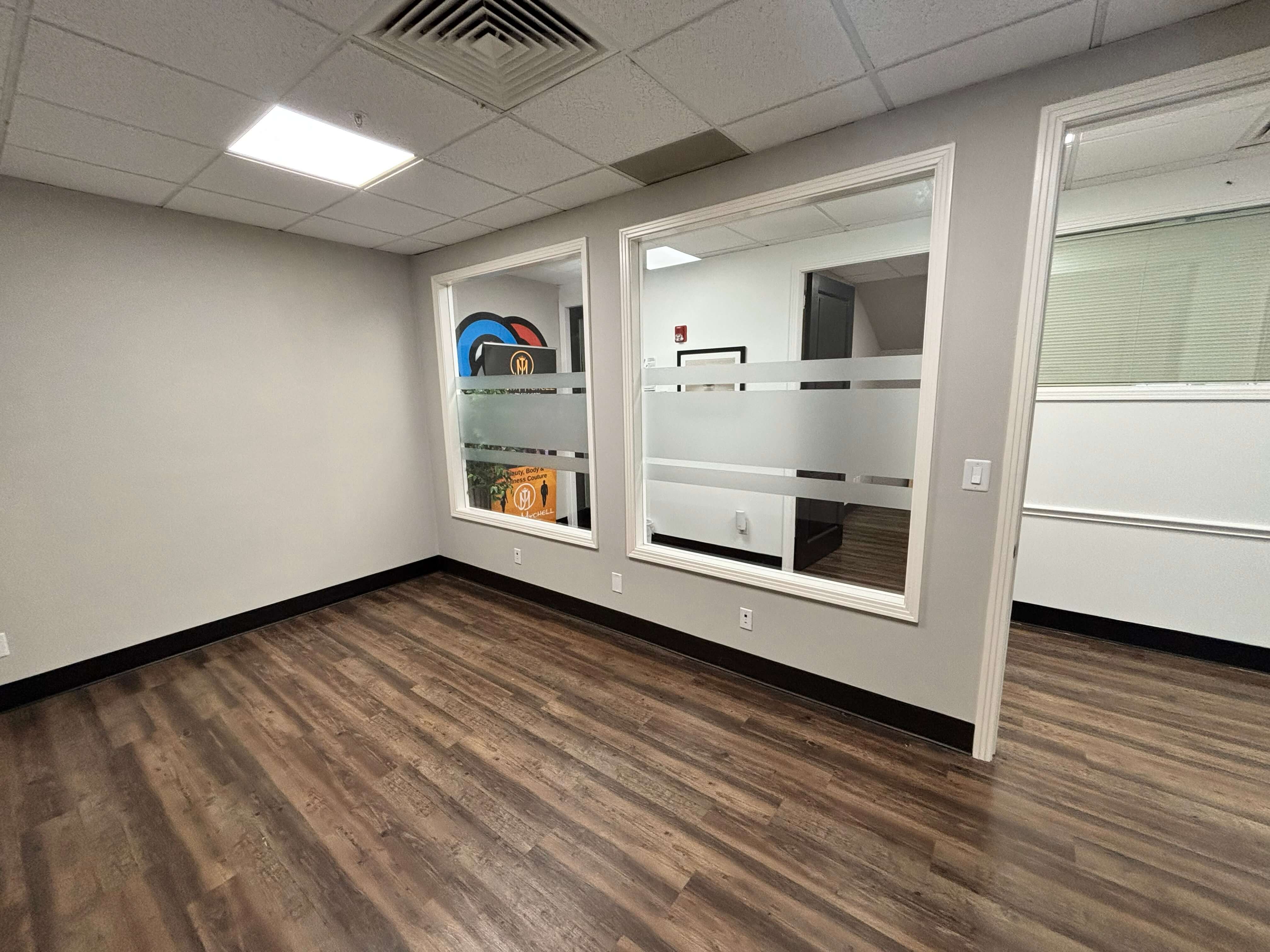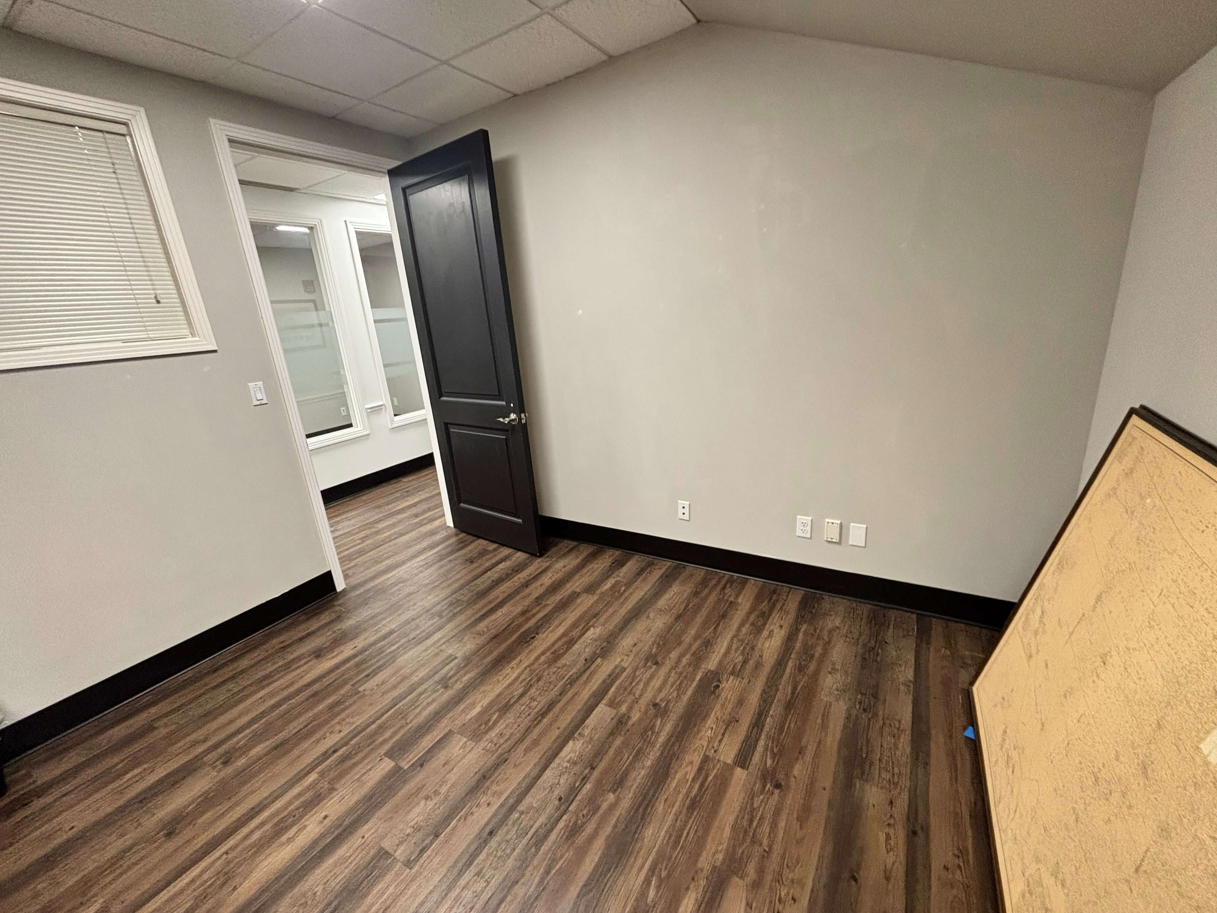 The suite features a welcoming reception and waiting lounge, three private offices, and a dedicated conference room, offering an efficient and professional layout ideal for client-facing businesses. A large kitchen, private ADA-compliant restroom, and central A/C provide everyday convenience, while modern finishes and vinyl plank flooring in common areas deliver a clean, contemporary feel.