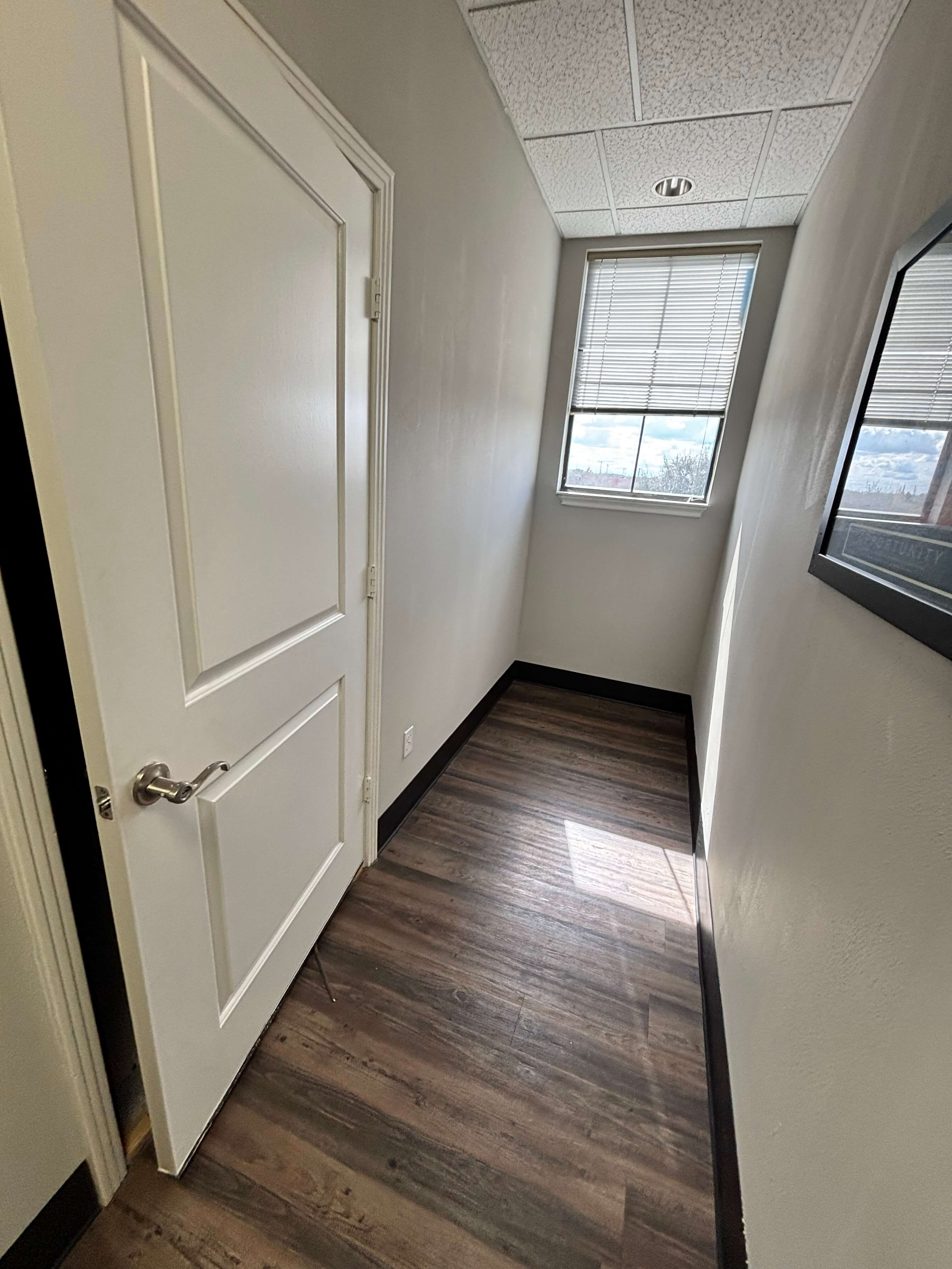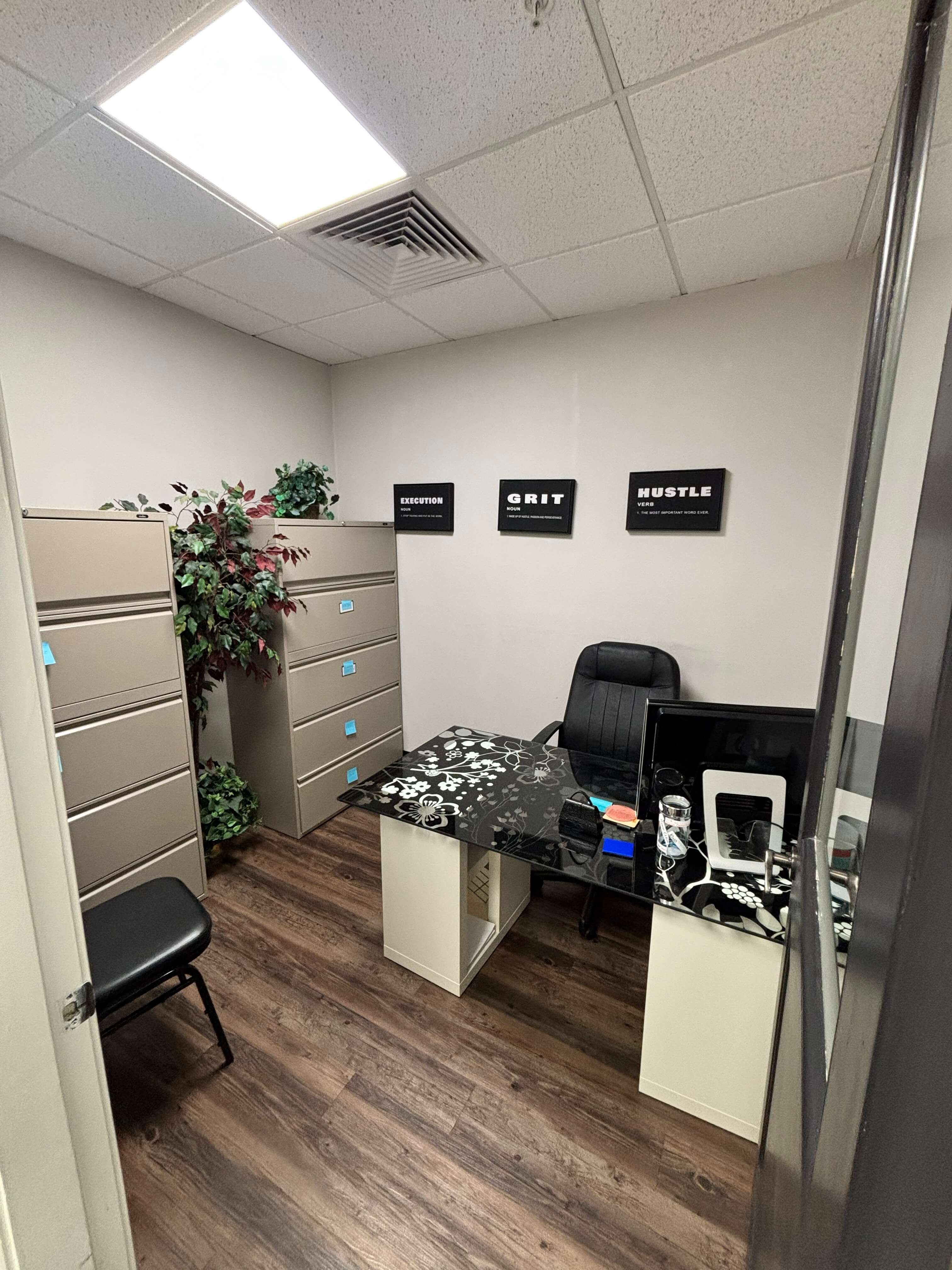 The elevator is located directly in front of the suite, and tenants enjoy 24-hour card-key access, private entry, and ample free parking, with covered parking available for a small monthly fee.
